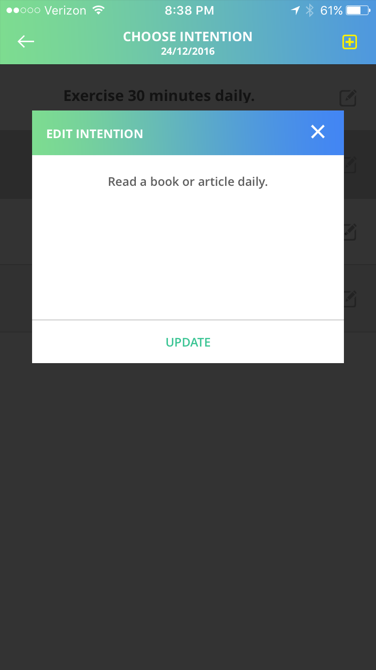 For those users who are clear on their purpose, enter it during set up and it will appear on your screen in that part of the app. In one quick click each day, document whether you are living on purpose.