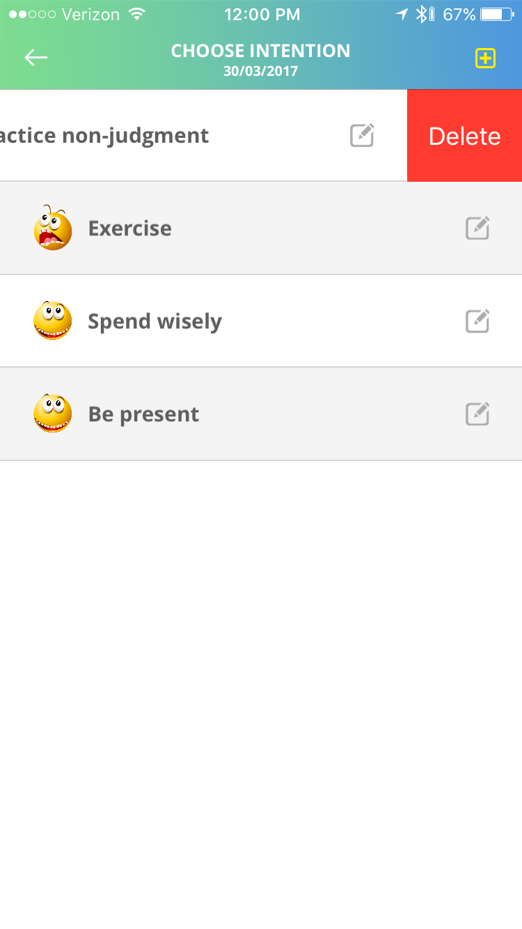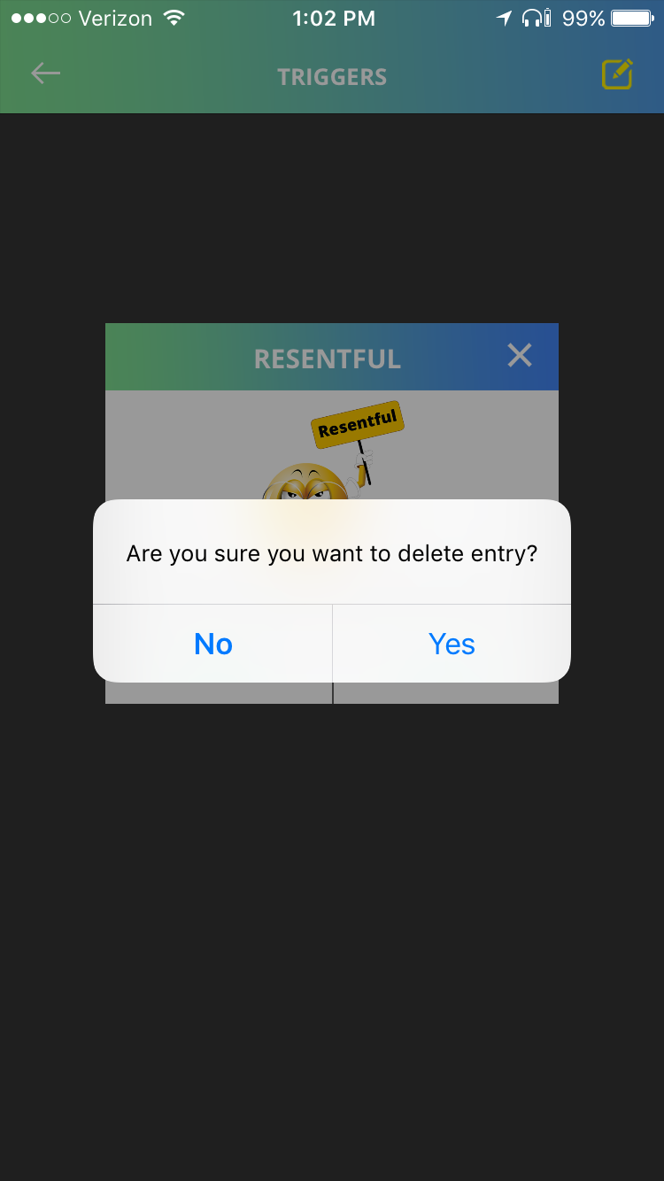 For daily intentions, swipe left to delete. For journal or trigger edits, revisit entry and make desired changes.